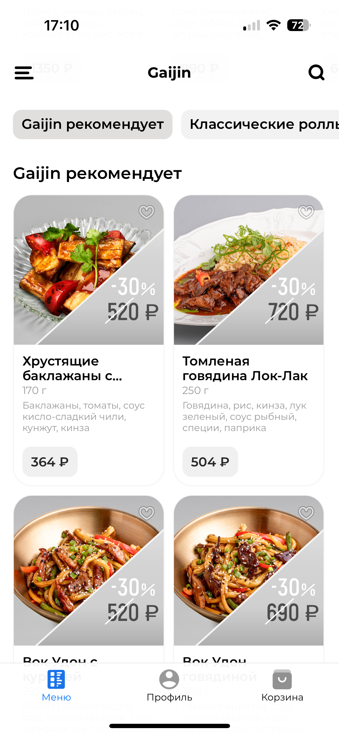 Королевский ролл с лососем и угрем; Ролл, запеченный с креветкой и сыром пармезан; Ролл, запеченный с угрем и луком фри; Темпура-тако с угрем; Ролл "Лосось и соленая карамель"; Запеченные суши: с лососем 2 шт., с тунцом 2 шт., с угрем 2 шт., с гребешком 2 шт.