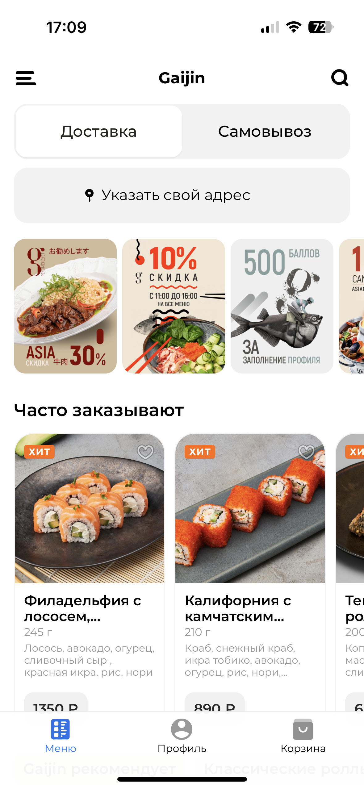 Филадельфия с лососем; Калифорния с крабом; ролл "Лосось, клубника, базилик"; Ролл с лососем, авокадо и чуккой; ролл с тунцом и соусом юдзу; суши: спайси с лососем 2 шт, с тунцом 2шт., с угрем 2 шт., с гребешком 2шт.