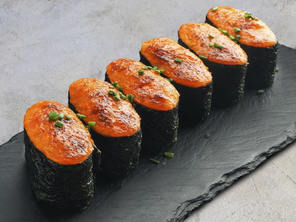 Лосось, окунь, креветка, кальмар, гребешок, тунец, рис, нори, зеленый лук, соус из икры летучей рыбы