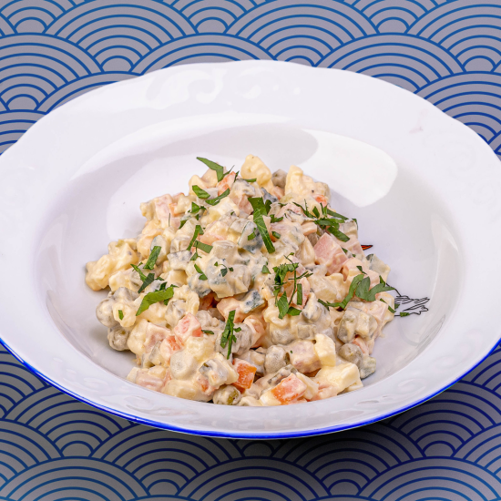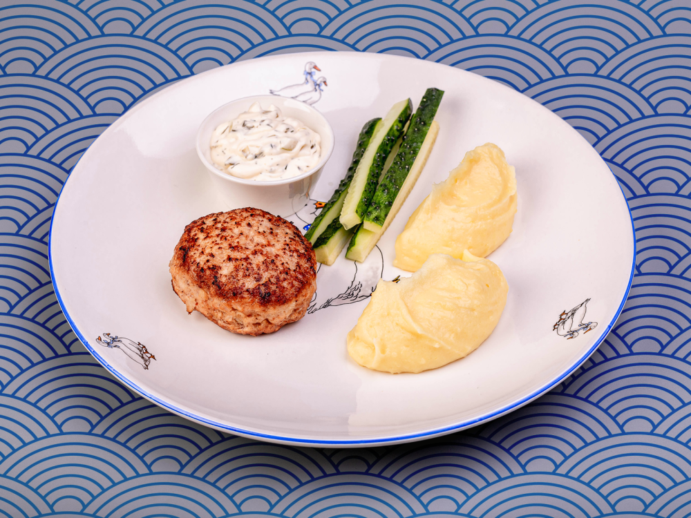 Куриное филе, лук, картофельное пюре, помидор черри, петрушка, соус тартар