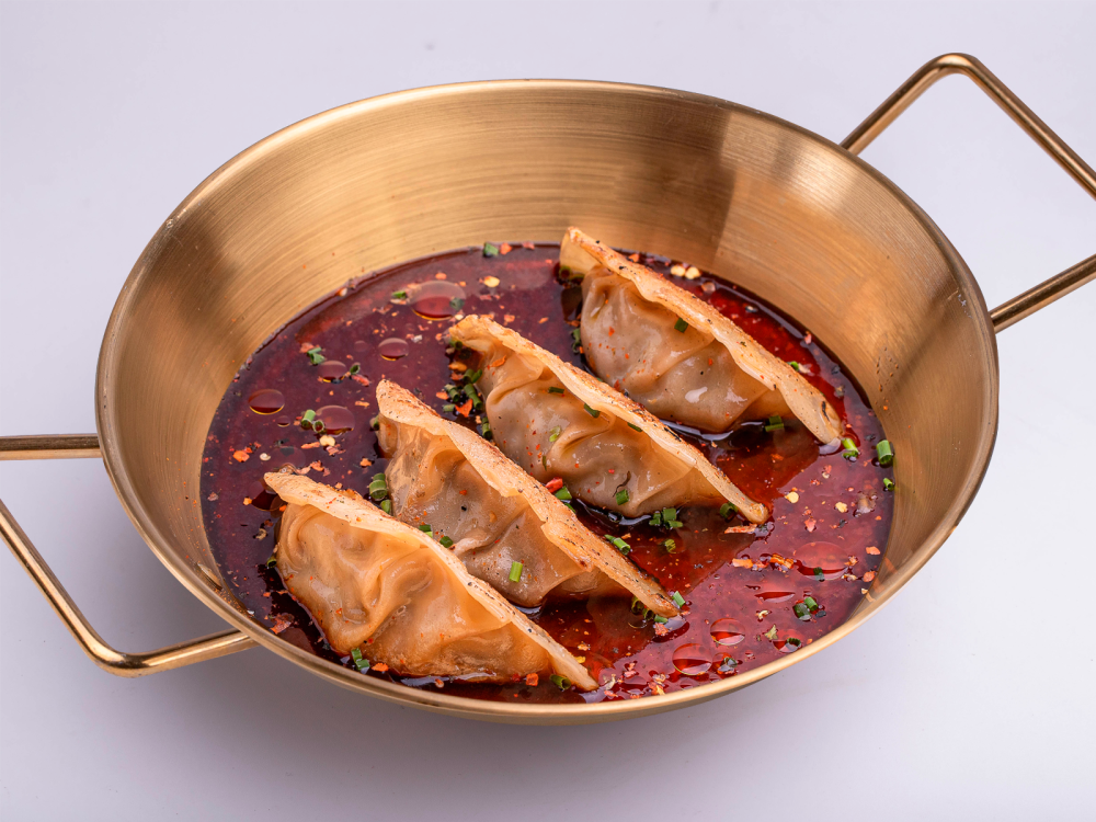 Тесто пшеничное, креветки королевские, соус для гедза, лук зеленый, кунжут