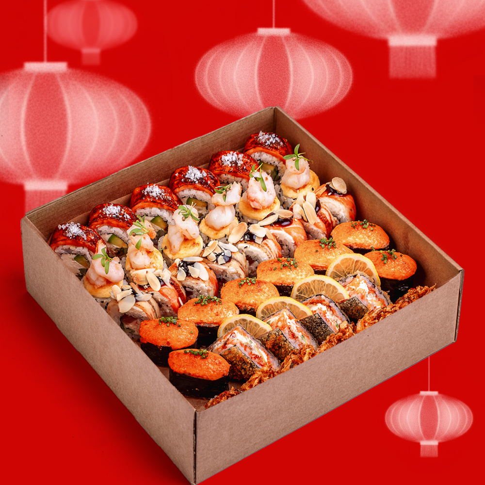 Королевский ролл с лососем и угрем; Ролл, запеченный с креветкой и сыром пармезан; Ролл, запеченный с угрем и луком фри; Темпура-тако с угрем; Ролл "Лосось и соленая карамель"; Запеченные суши: с лососем 2 шт., с тунцом 2 шт., с угрем 2 шт., с гребешком 2 шт.