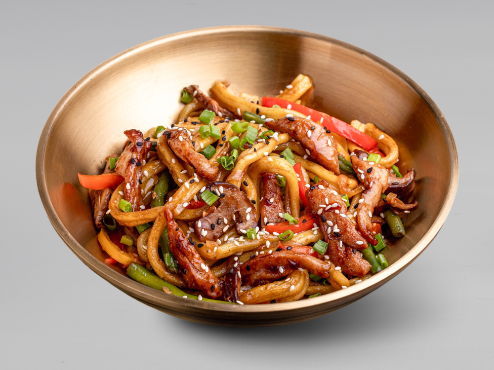 Филе куриного бедра, соус острый терияки, соус шрирача, соус устричный, шиитаке, фасоль, перец болгарский, морковь, лук репчатый, лук зеленый, лапша удон, масло растительное, кунжут