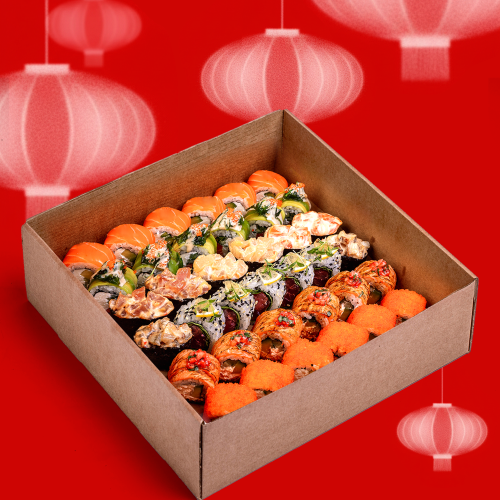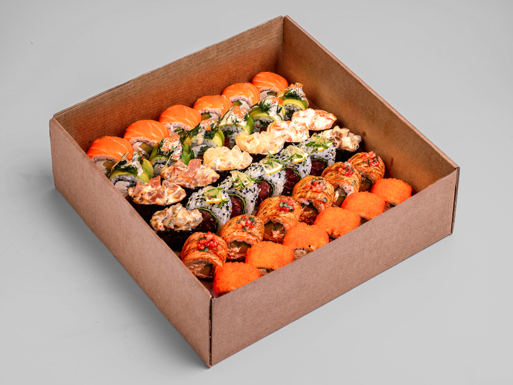 Филадельфия с лососем; Калифорния с крабом; ролл "Лосось, клубника, базилик"; Ролл с лососем, авокадо и чуккой; ролл с тунцом и соусом юдзу; суши: спайси с лососем 2 шт, с тунцом 2шт., с угрем 2 шт., с гребешком 2шт.