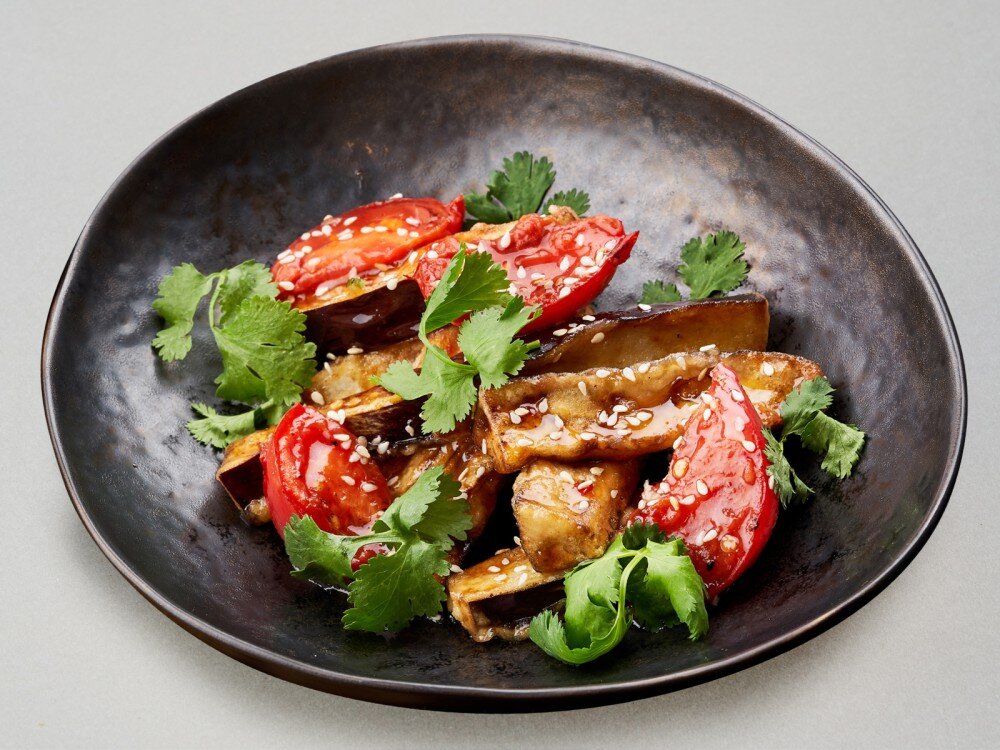 Баклажаны, томаты, соус кисло-сладкий чили, кунжут, кинза