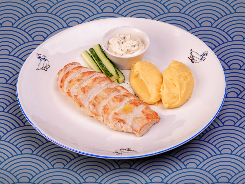 Куриное филе, картофельное пюре, соус тартар, огурец