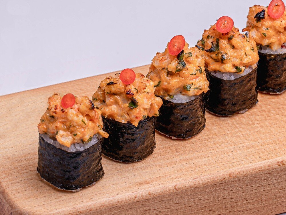 Томаты, сыр творожный, соус том-ям, рис, креветки, кинза, вешенки, нори