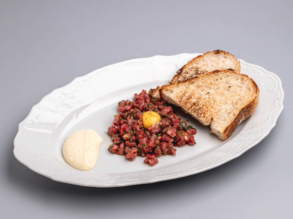 Говяжья вырезка, репчатый лук, каперсы, оливковое масло, залень, чиабатта, перепелиное яйцо, соус трюфельный айоли