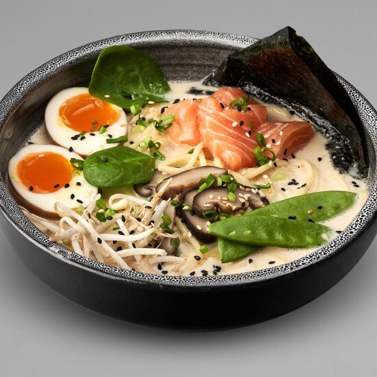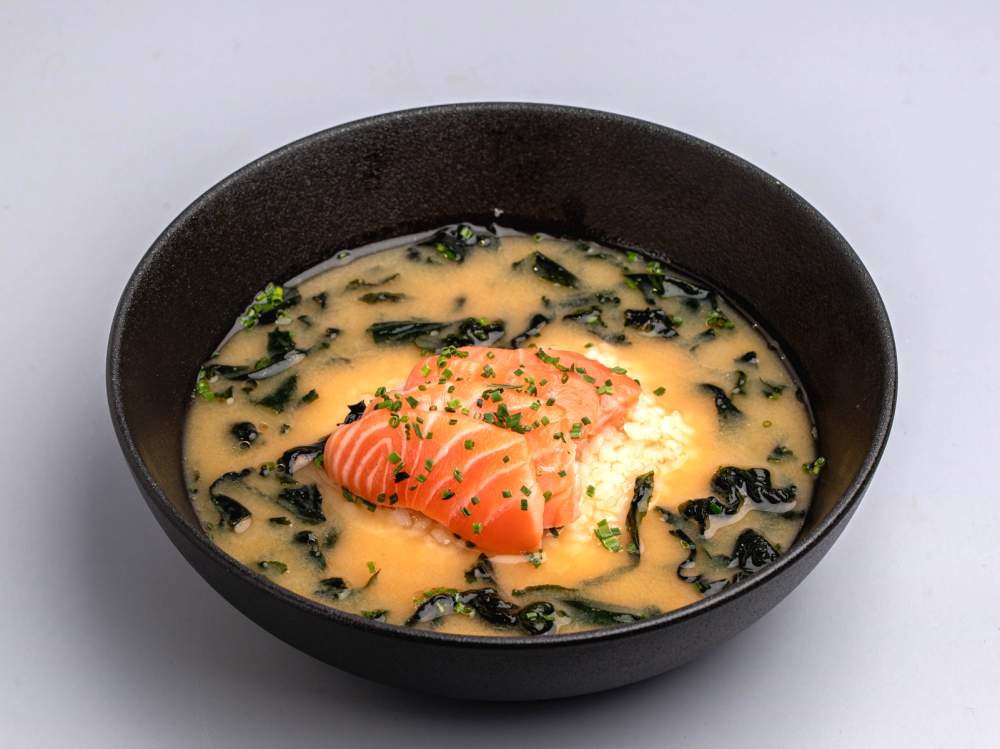 Лосось, водоросли вакамэ, бульон мисо, сливки, рис, лук зеленый