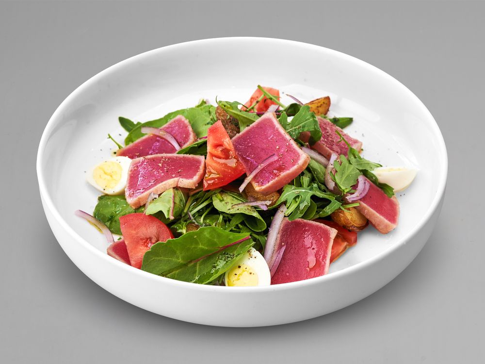 Тунец, микс салатов, картофель стоун, базилик, яйцо, соус понзу, томаты, соль, перец