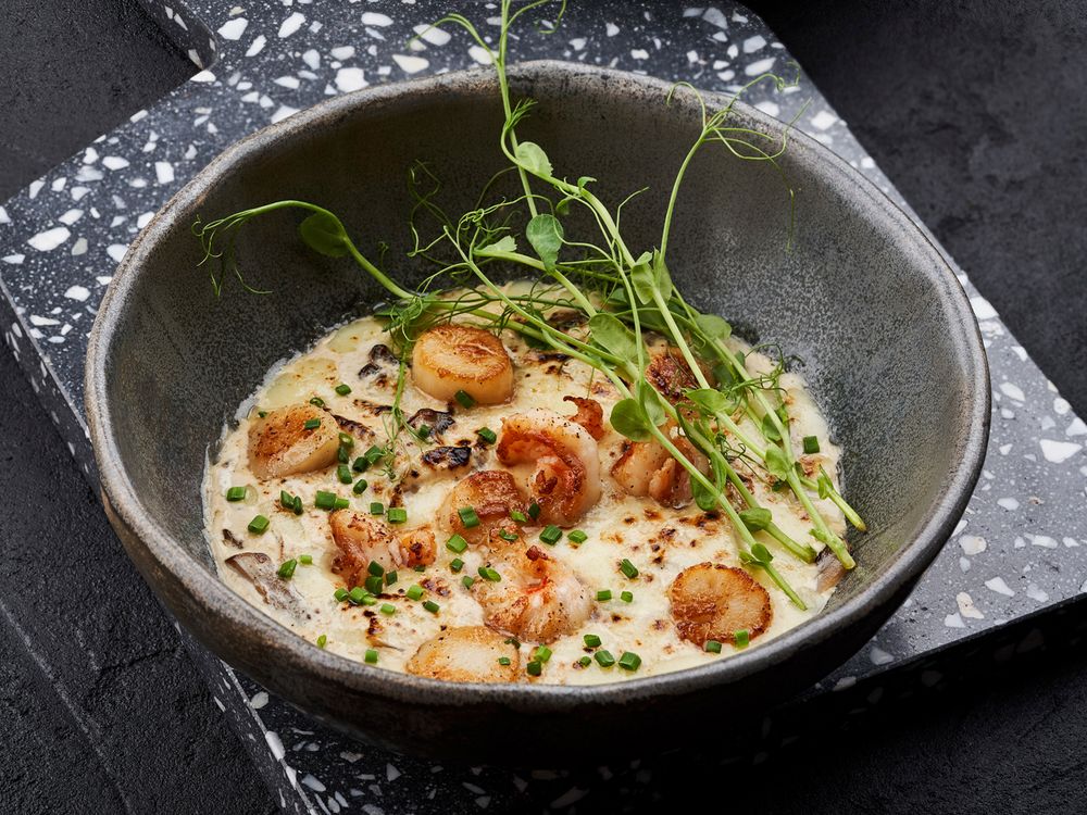 Морской гребешок, креветки, шампиньоны, лук репчатый, вино белое, сливки, моцарелла, сибулет