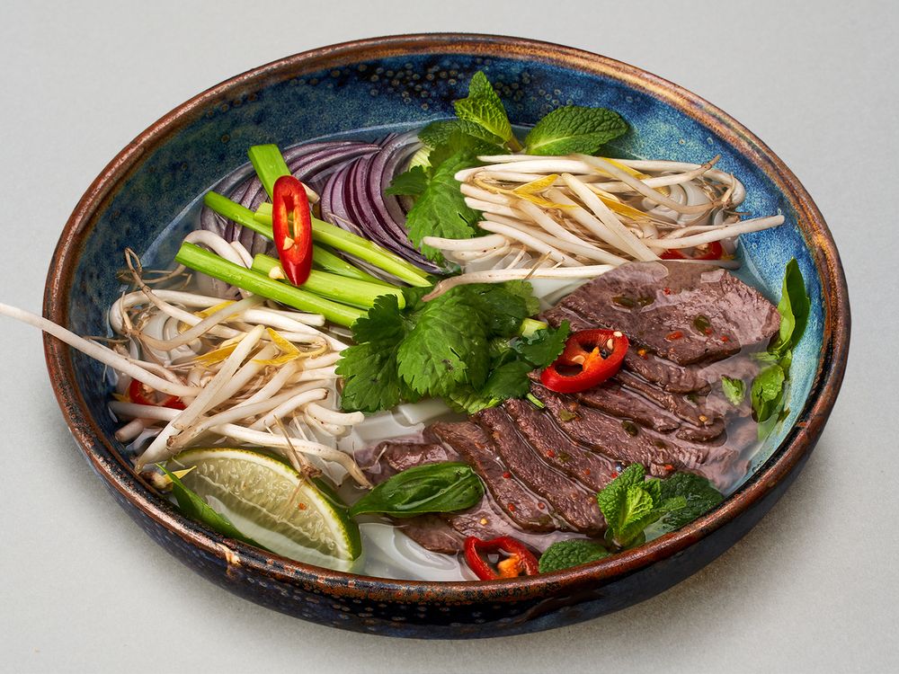 Говядина, лапша рисовая, бульон фо бо, лук зеленый, лук красный, перец чили, ростки сои, лайм, кинза, мята, базилик
