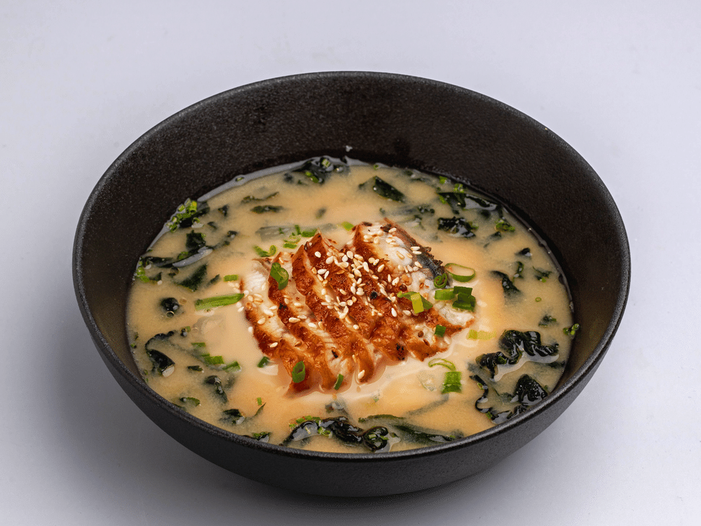 Копченый угорь, бульон мисо, сливки, рис, зеленый лук, кунжут