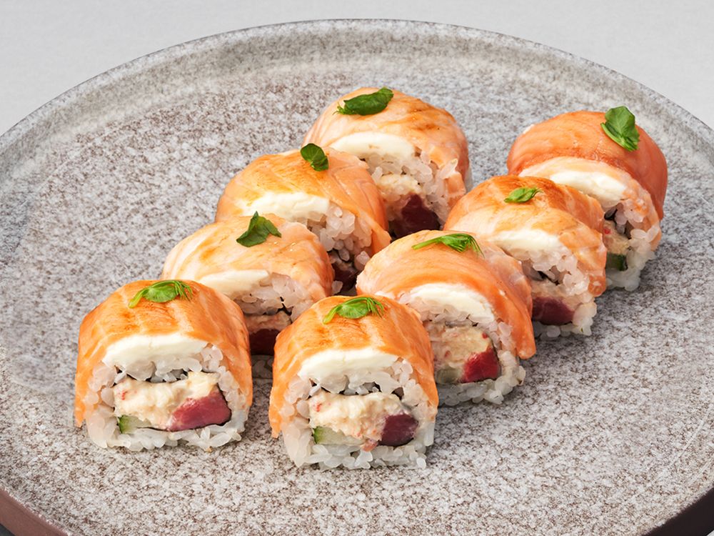 Запеченный ролл с лососем под соусом с икрой летучей рыбы