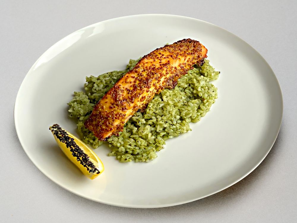Стейк из лосося с рисом песто