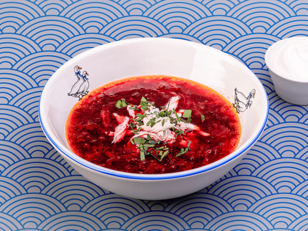 Куриное филе, куриный бульон, сметана, зелень, свекла, морковь, лук репчатый, капуста, паста томатная