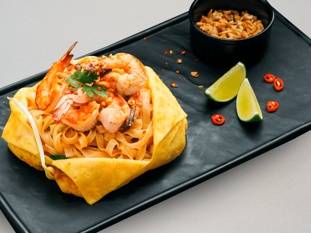 Тигровые креветки, яйцо куриное, лапша рисовая, тамаго, сыр тофу, лук репчатый, чеснок, арахис, кинза, лук зеленый, лайм, перец чили, соус рыбный, соус пад тай