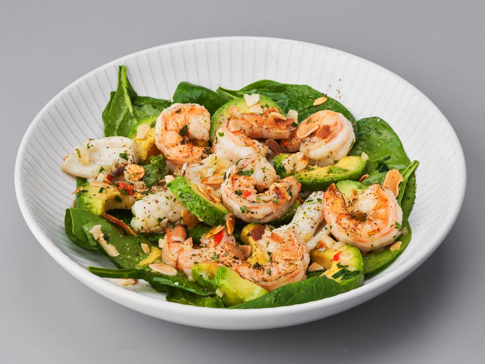 Креветки, кальмар, авокадо, специи, листья шпината