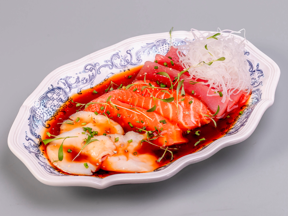 Лосось, гребешок, тунец, соус юдзу, кинза, чивис, перец чили, редис
