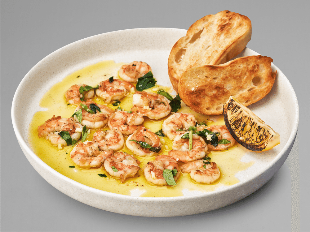Креветки тигровые, масло растительное, чеснок, специи, пармезан, базилик