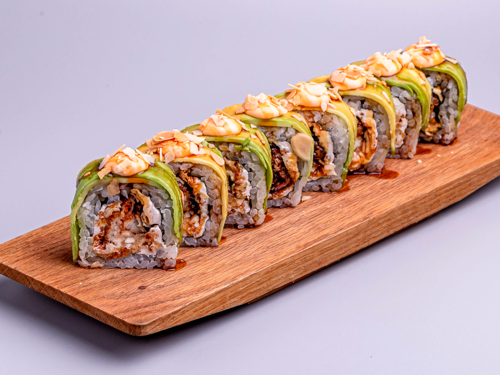 Рис нишики, нори, творожный сыр, омлет тамаго, угорь, темпура, авокадо, соус спайси, соус унаги, миндаль, лук фри