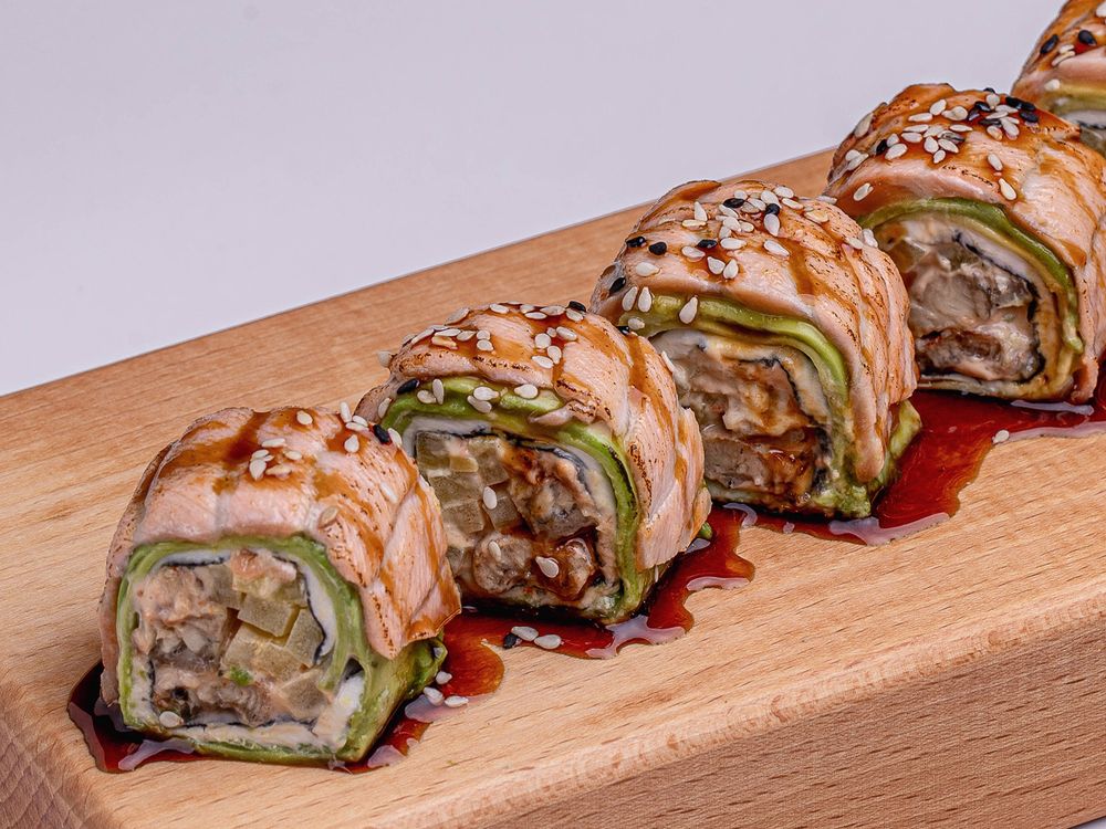 Ролл с лососем, авокадо и соусом юдзу