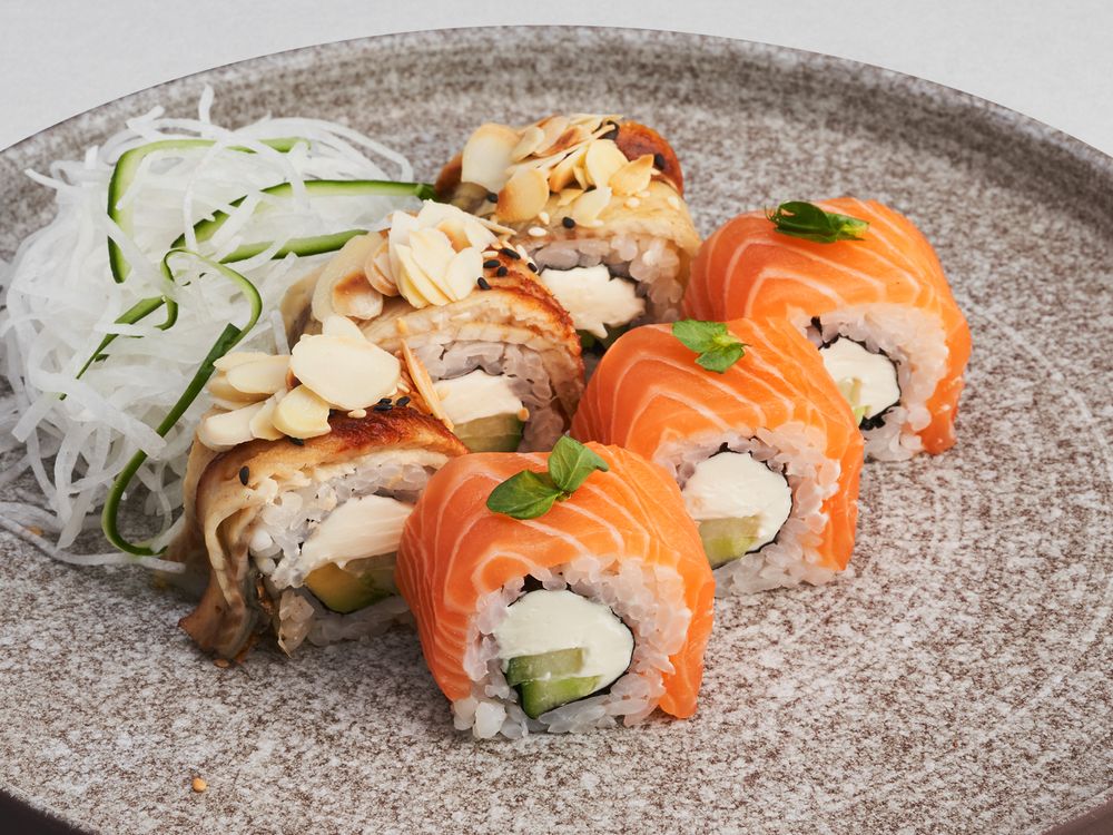 Угорь, лосось, сливочный сыр , авокадо, огурец, рис, нори, миндаль, кунжут