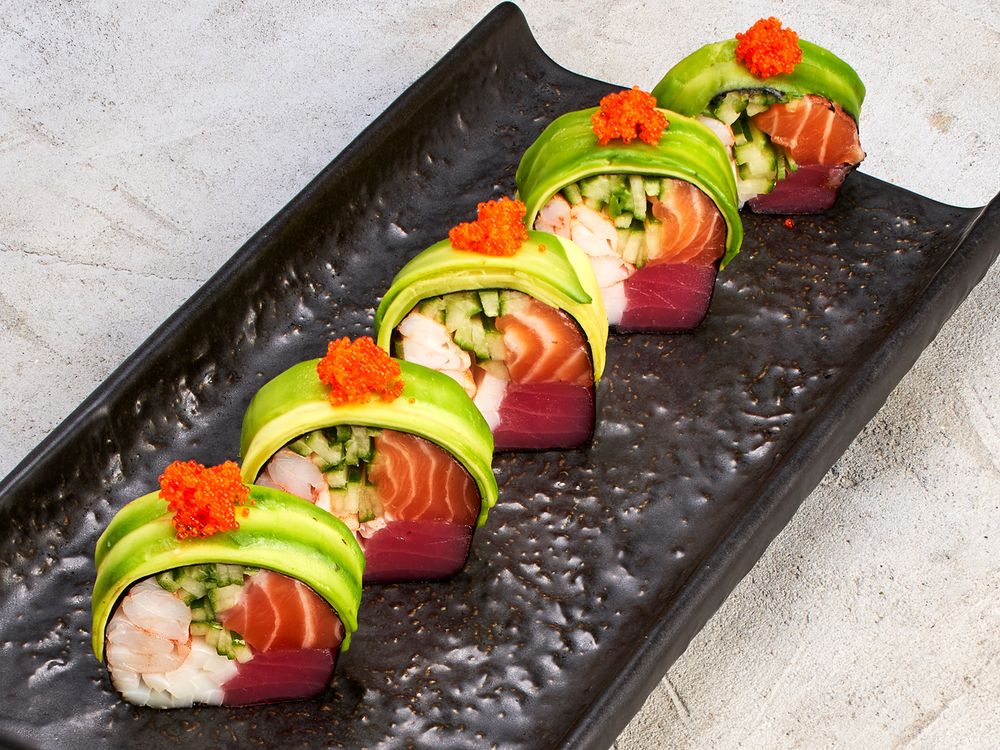 Тунец, лосось, креветки, кальмар, огурец, авокадо, тобико, соус понзу, нори