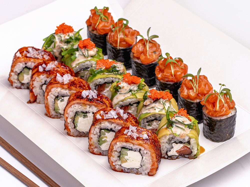 Ролл с тартаром из лосося, ролл лосось в соленой карамели, ролл с лососем, авокадо и чукой