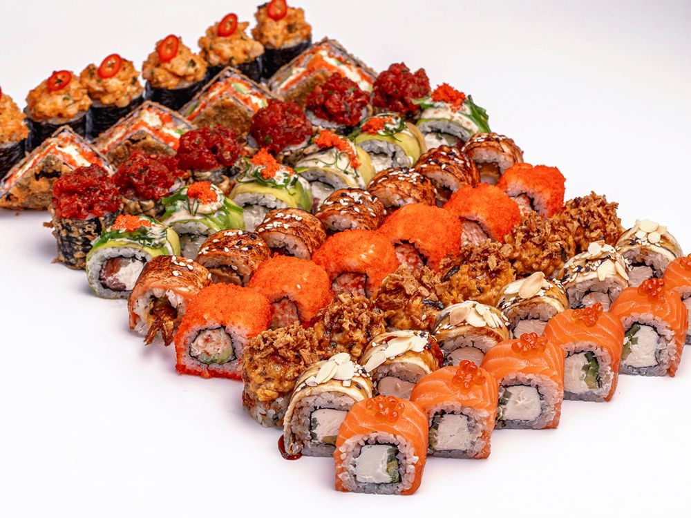 Филадельфия с лососем, калифорния с крабом, запеченный ролл с креветкой и сыром пармезан, опаленный ролл с лососем и креветкой, запеченый ролл с угрем и луком фри, ролл темпура с тартаром из тунца, ролл с лососем, авокадо и чукой, филадельфия с угрем, теплый тако-ролл с угрем
