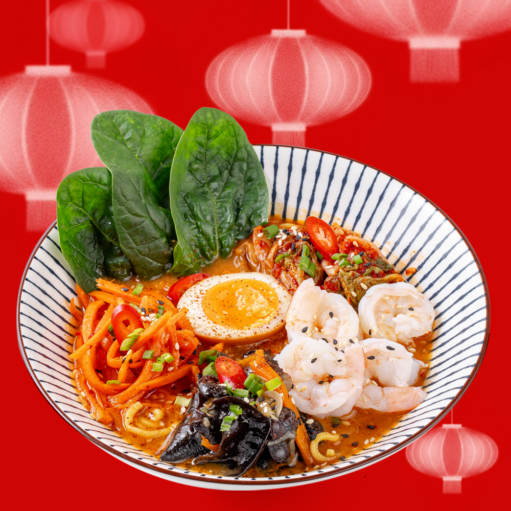 Лапша рамен, бульон рамен мисо, яйцо маринованное, морковь по-корейски, грибы моэр, пекинская капуста кимчи, шпинат, кунжут, зеленый лук, перец чили, креветки