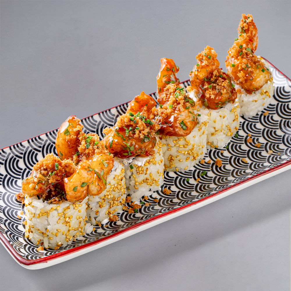 Креветки в кляре, творожный сыр, огурцы, авокадо, кунжут юдзу, соус тайский чили, темпурная крошка, рис, нори
