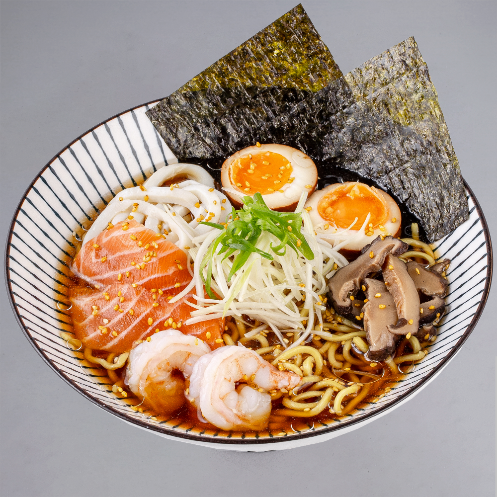Бульон рыбный сифуд, лапша рамен, кальмар, креветки, лосось, яйцо маринованое, лук порей, зеленый лук, нори, кунжут, шиитаке
