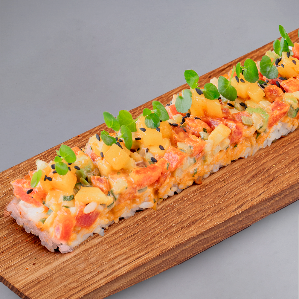 Тунец, огурцы, авокадо, соус кунжутный кимчи, манго, кунжут, микрозелень, нори, рис
