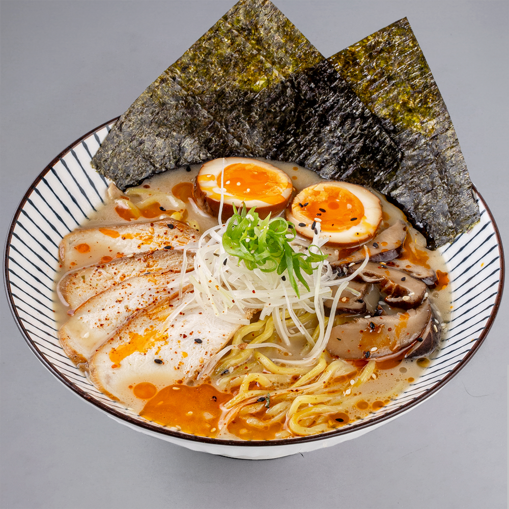 Бульон Пайтан куриный, сею таре, лапша рамен, курица, лук порей, зеленый лук, яйцо маринованное, шиитаке, масло ароматное, чили масло, переч шичими, кунжут, нори