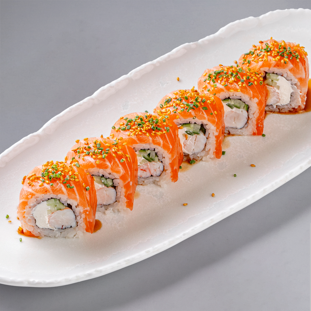 Лосось, креветки, творожный сыр, огурцы, соус юдзу, кунжут юдзу, чивис, рис, нори