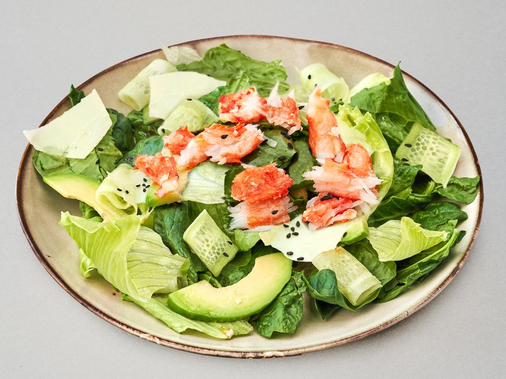 Ромейн, шпинат, авокадо, огурец, пармезан, оливковое масло, мед, сок лимона, камчатский краб