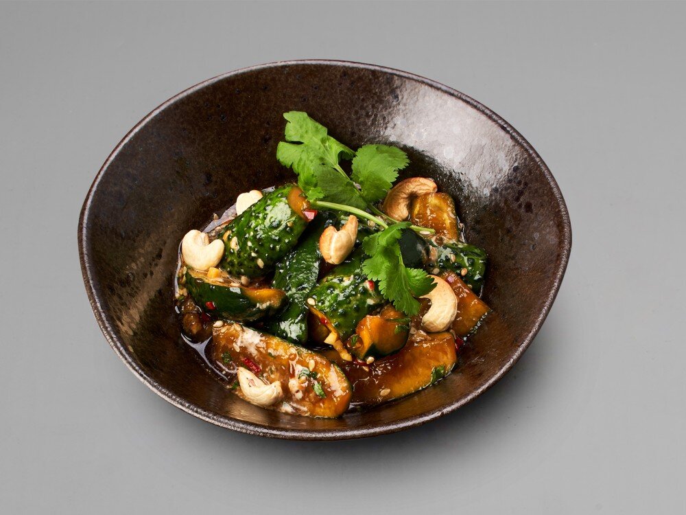 Огурцы битые, кешью, перец чили, мед, чеснок, кинза, кунжут, кунжутное масло, устричный соус, соус шрирача, ореховый соус, соевый соус, уксус рисовый