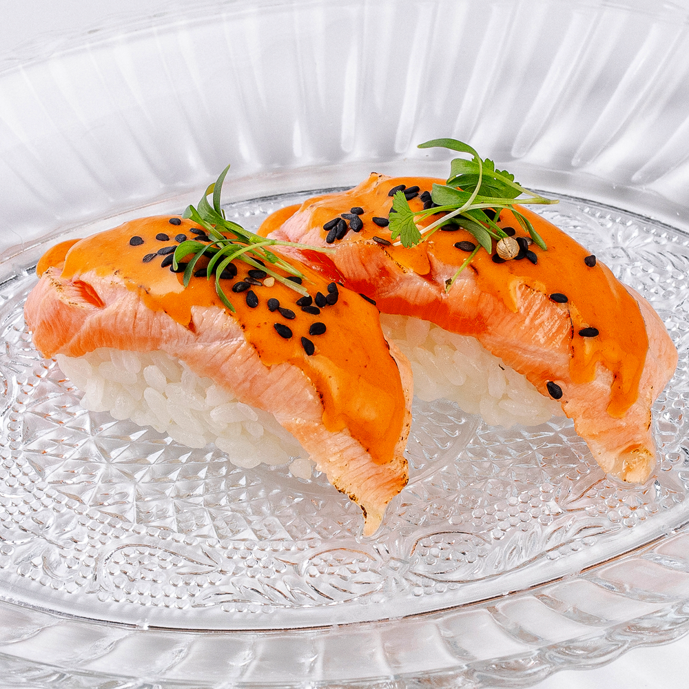 Рис, лосось, соус том ям, васаби, кунжут, микрозелень