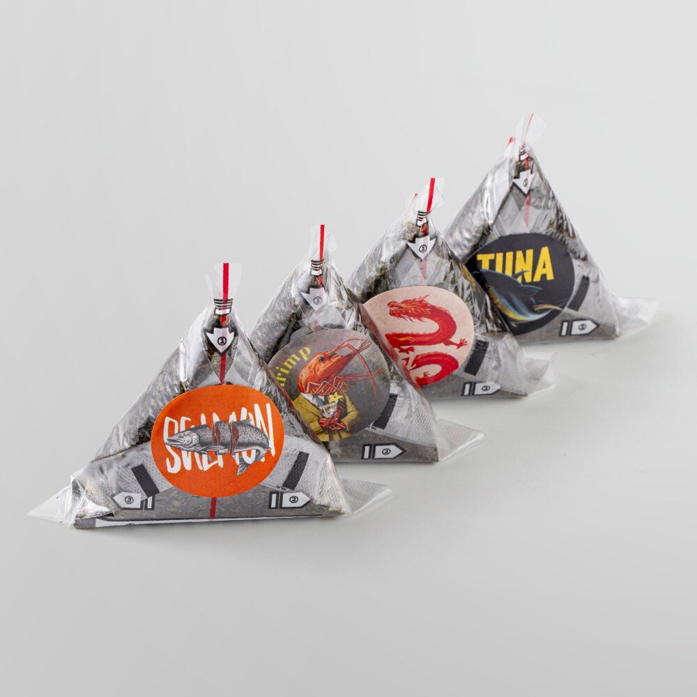 Онигири с креветкой, Онигири с лососем, Онигири с угрём, Онигири с тунцом