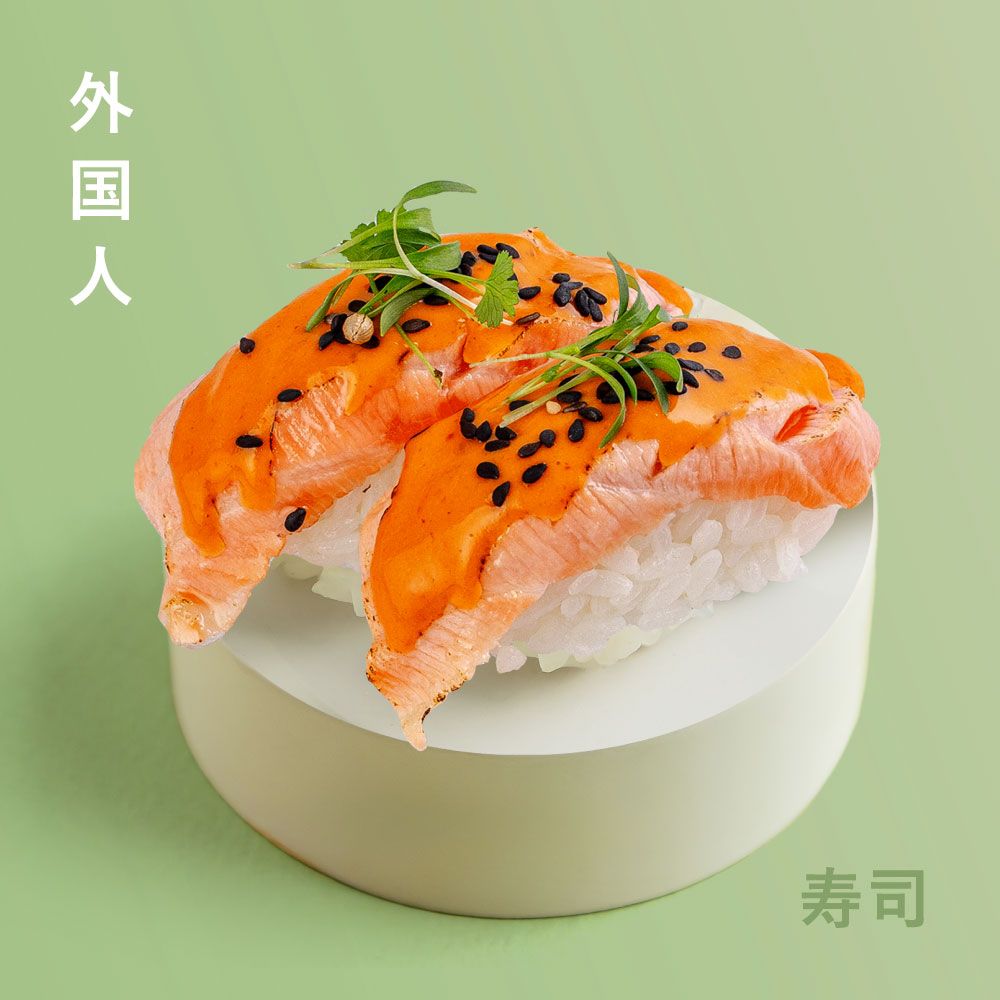 Рис, лосось, соус том ям, васаби, кунжут, микрозелень