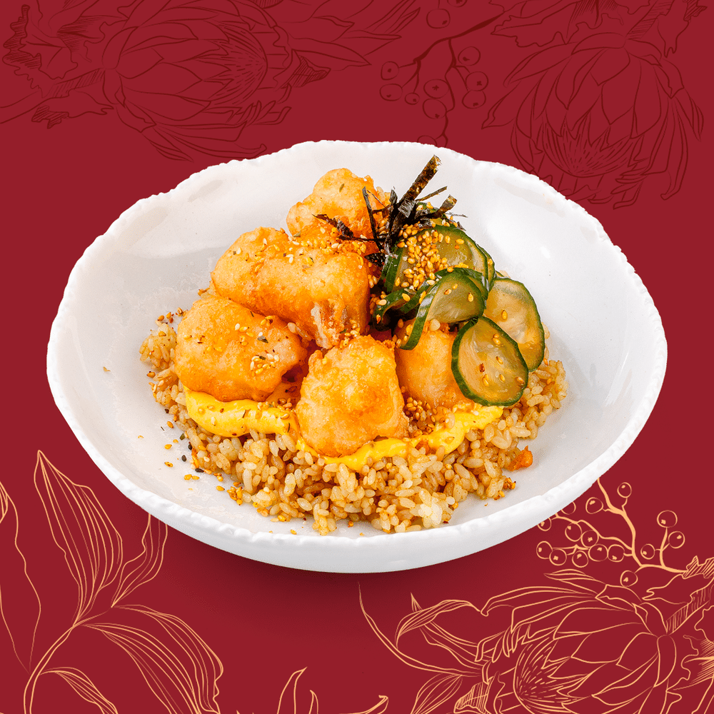 Треска, огурцы кимчи, кунжут, карри, мука темпурная, тесто темпурное, рис, соус майо