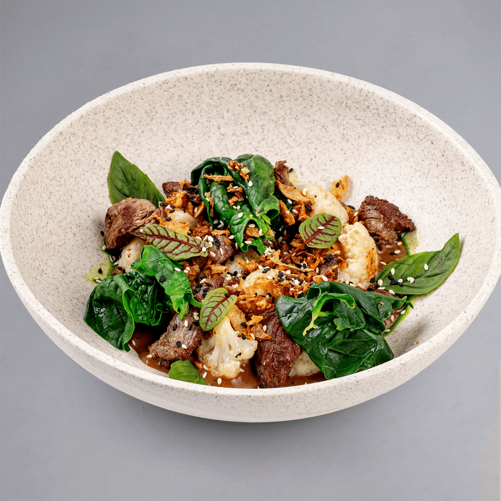 Говядина, цветная капуста, соус перечно-грибной, базилик, жареный лук, микрозелень, шпинат, перец болгарский, томаты, кунжут