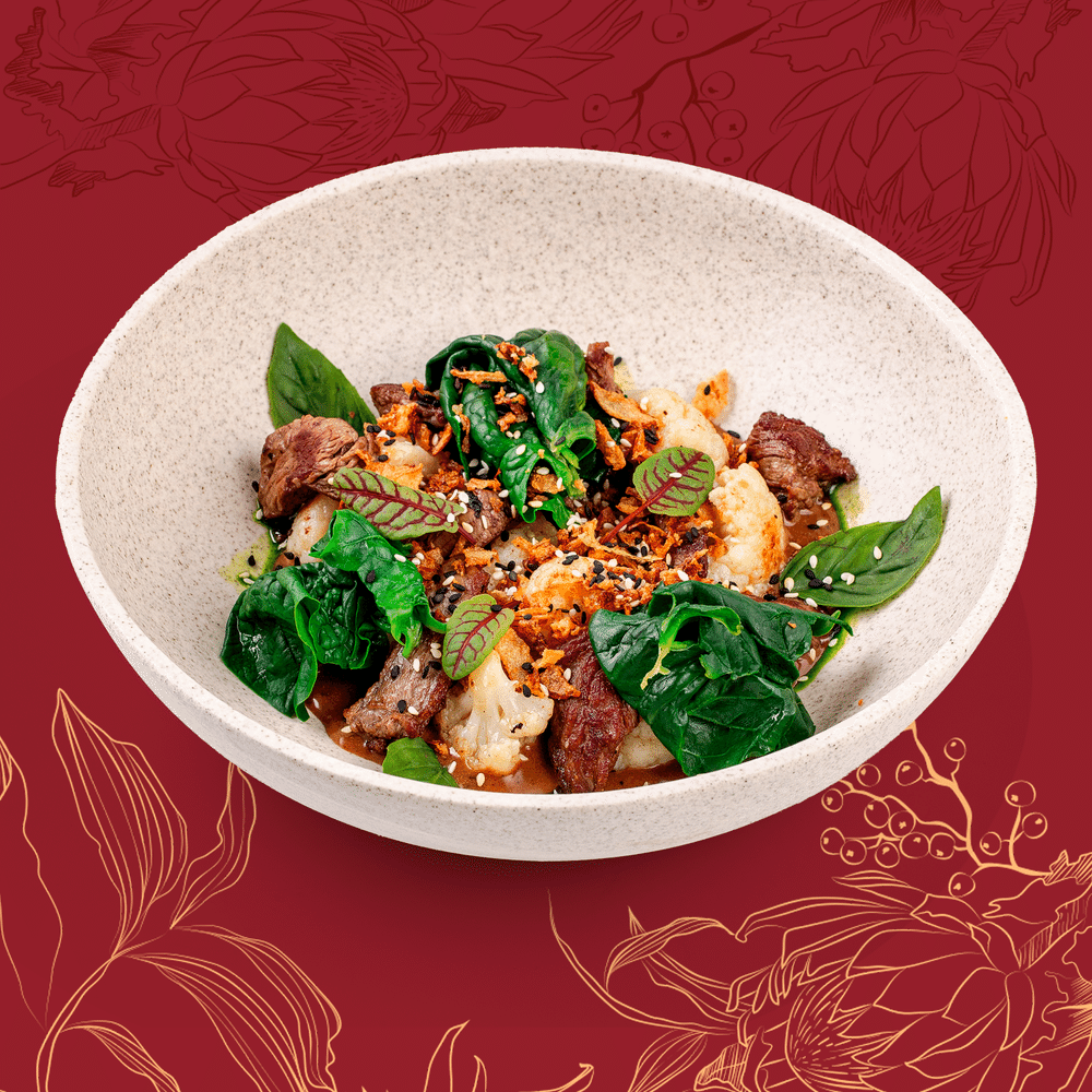 Говядина, цветная капуста, соус перечно-грибной, базилик, жареный лук, микрозелень, шпинат, перец болгарский, томаты, кунжут