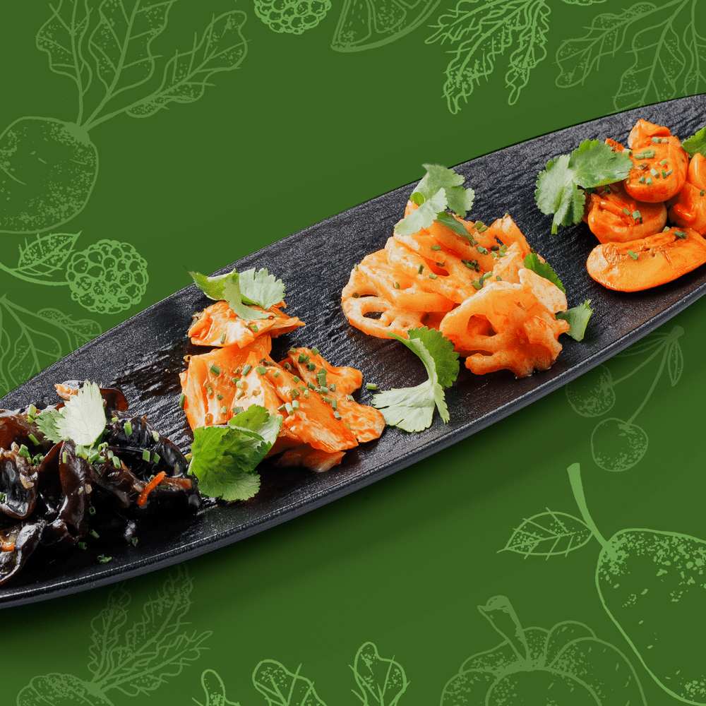 Маринованные вешенки, маринованный корень лотоса, маринованные шампиньоны, грибы моэр, сибулет, кинза