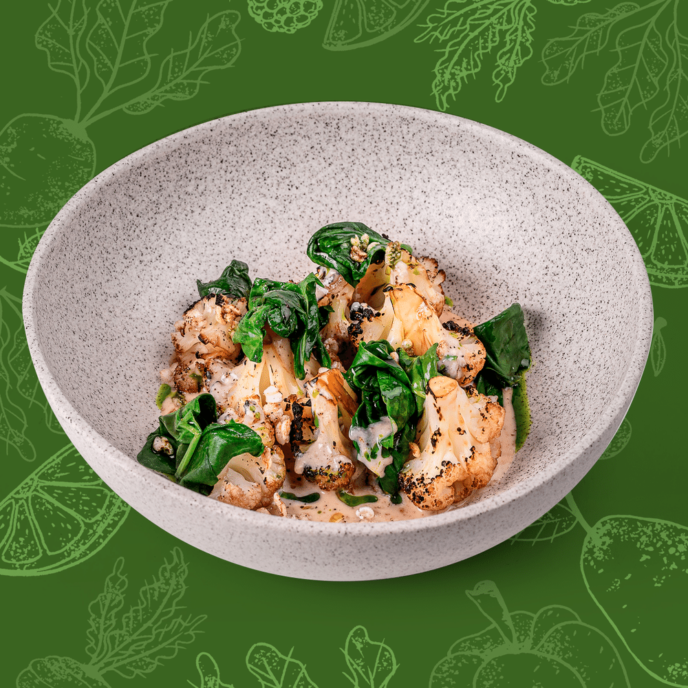 Цветная капуста, соус терияки, шпинат, соус ореховый, трюфельное масло, постный пармезан, ситронет
