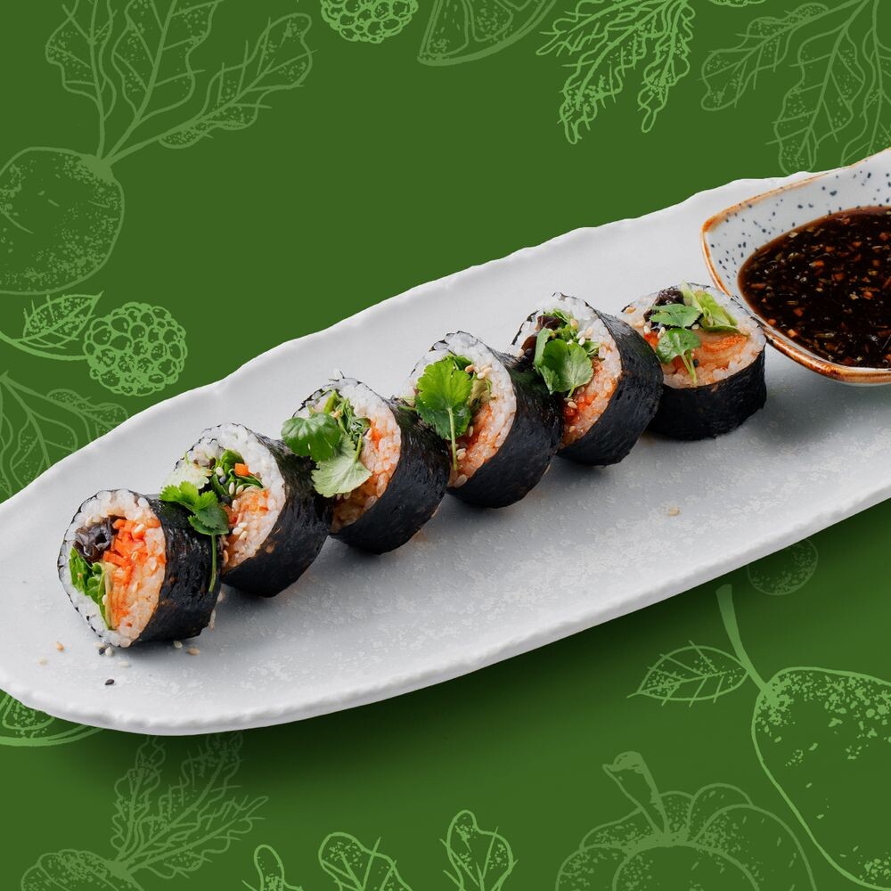 Рис, кунжутное масло, нори, морковь по-корейски, грибы моэр, капуста кимчи, салат ромейн, кунжут, микрозелень, соус тайский чили