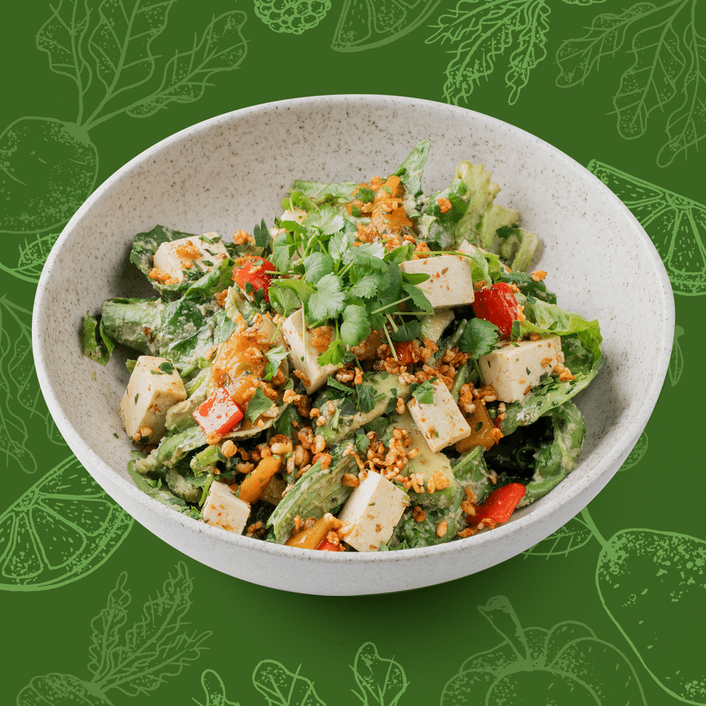 Ромейн, шпинат, тофу, перец маринованный, авокадо, хлопья гречневые, петрушка