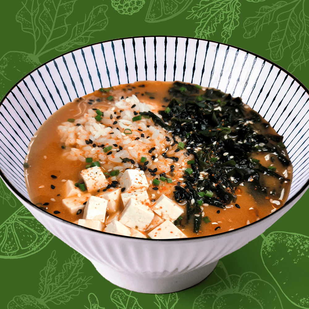 Бульон мисо, сыр тофу, водоросли вакамэ, зеленый лук, кунжут, соус кимчи, масло кунжутное, перец тогараси, рис